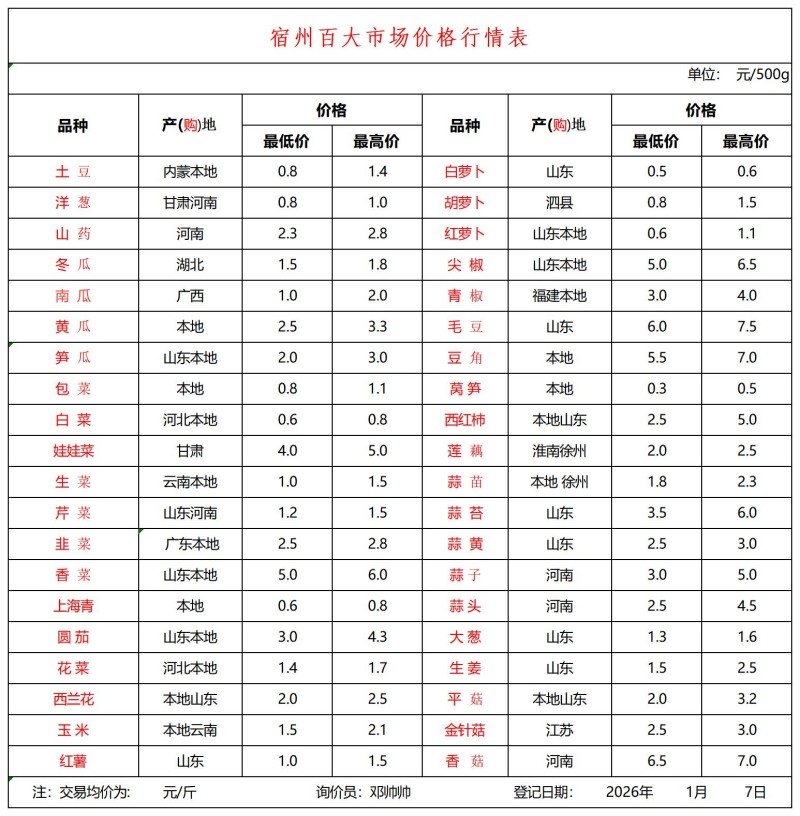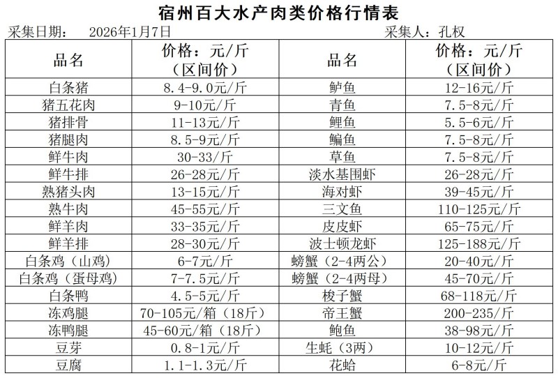 宿州百大2026-01-07价格行情