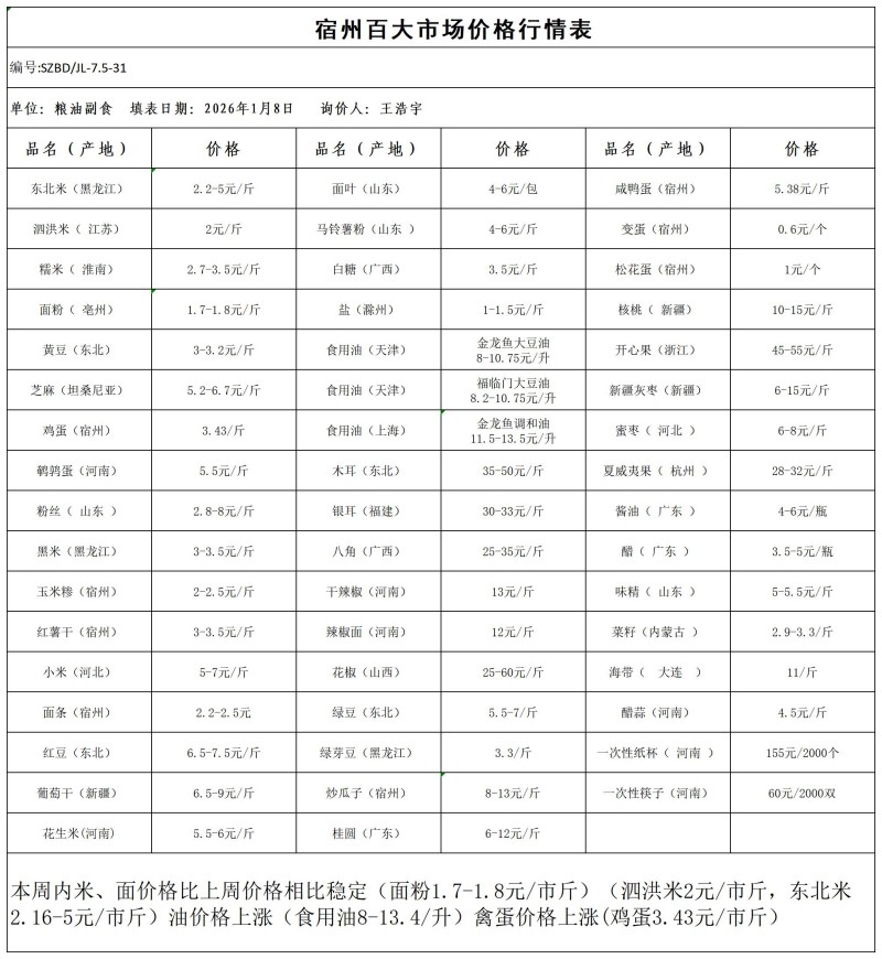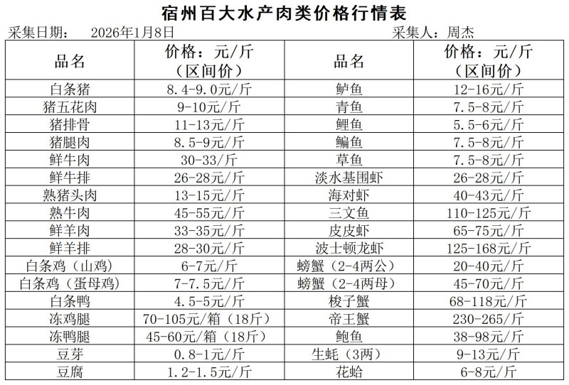 宿州百大2026-01-08价格行情