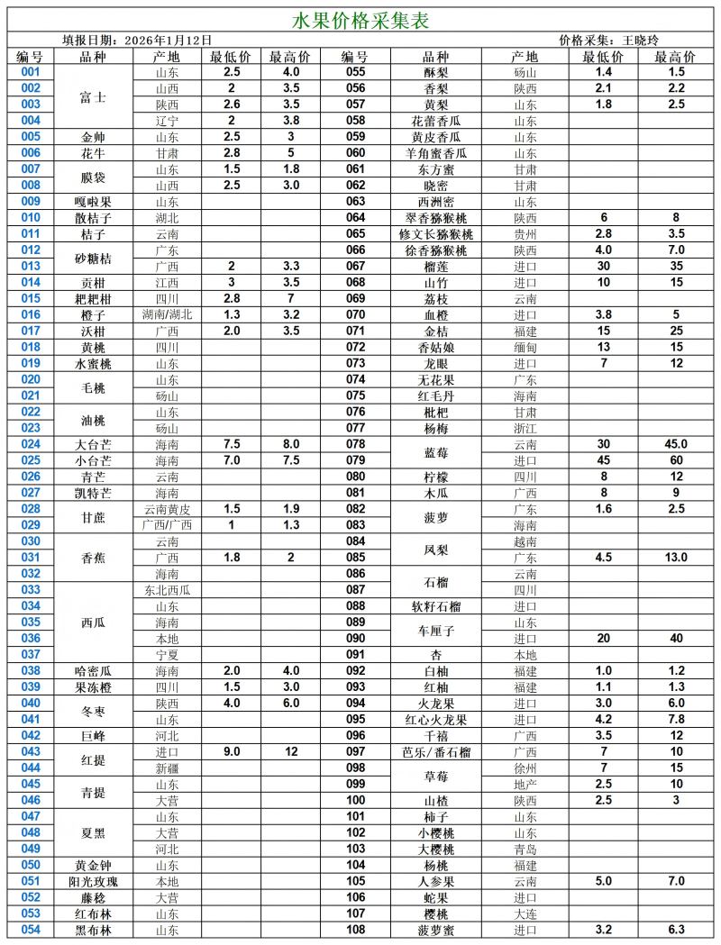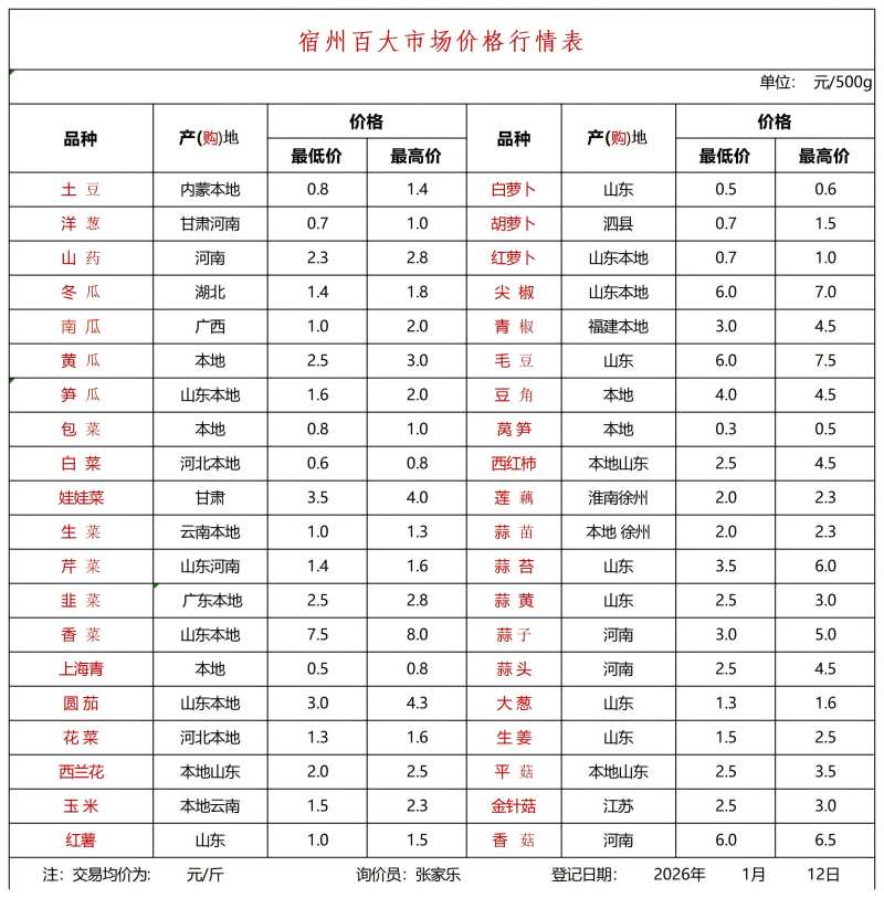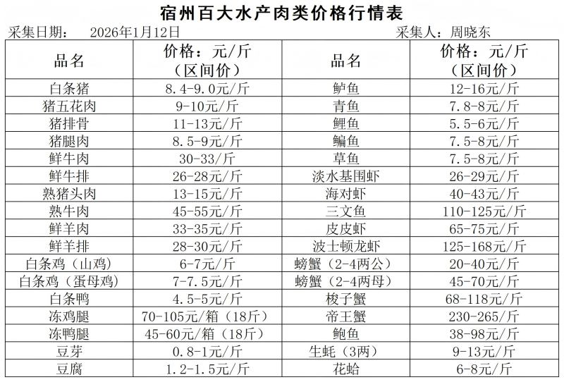 宿州百大2026-01-12价格行情