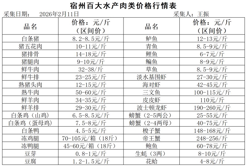 宿州百大2026-02-11价格行情