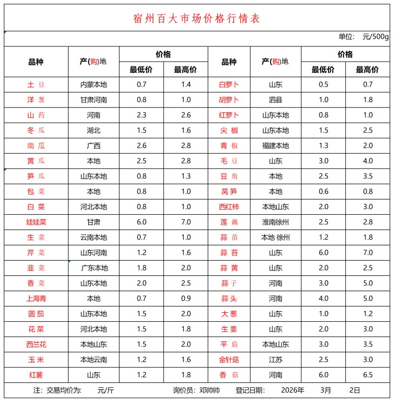 宿州百大2026-03-02价格行情