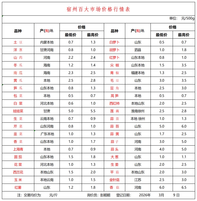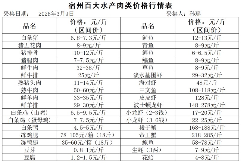 宿州百大2026-03-09价格行情