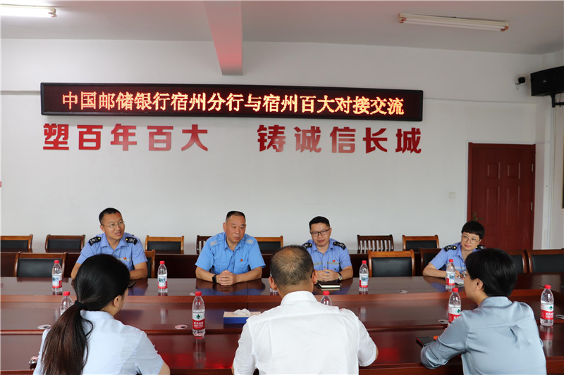 宿州百大董事长王静对祖传文行长一行的到来表示热烈欢迎,王董简要介绍了宿州百大的基本情况、业务经营模式及市场发展方向。他指出,通过此次深入交流会谈,我司将进一步加强和邮储银行宿州分行的交流,推动银企更深入的合作,同时对邮储银行宿州分行的工作开展表示支持。争取早日实现合作,开创互利共赢的新局面。