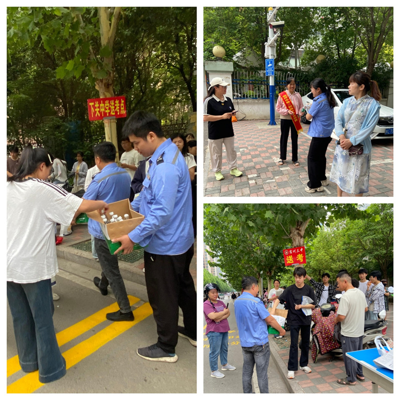 党员、团员、青年职工代表齐聚宿州三中校区考点,给参加考试的学生、送考家长送去矿泉水,同时祝考生,高考顺利,金榜题名;在发放物品的现场,党员们还积极配合考场执勤交警、民警维护考场周边的秩序,提醒现场来往人员不可喧哗,得到送考家长的广泛赞誉。